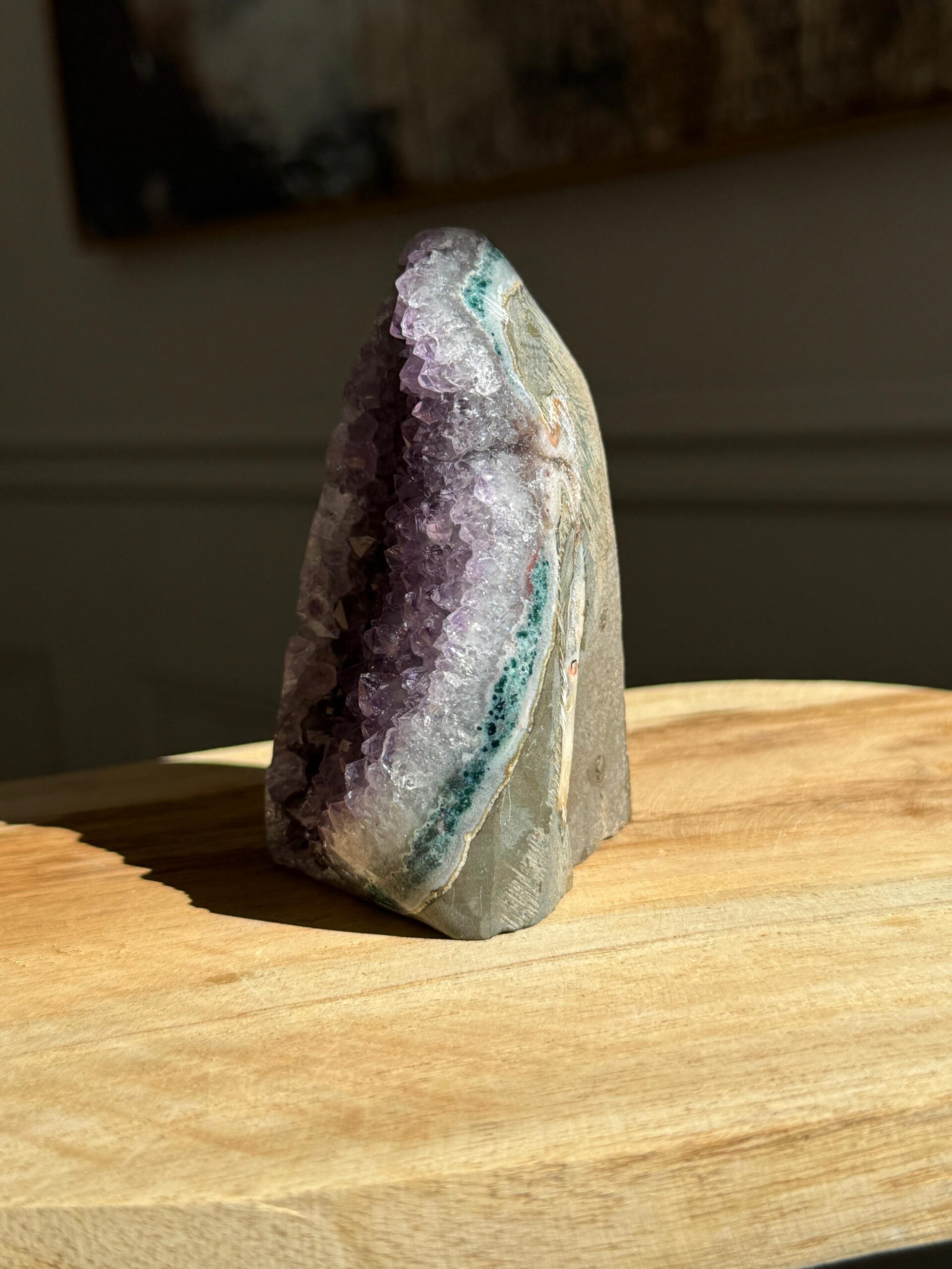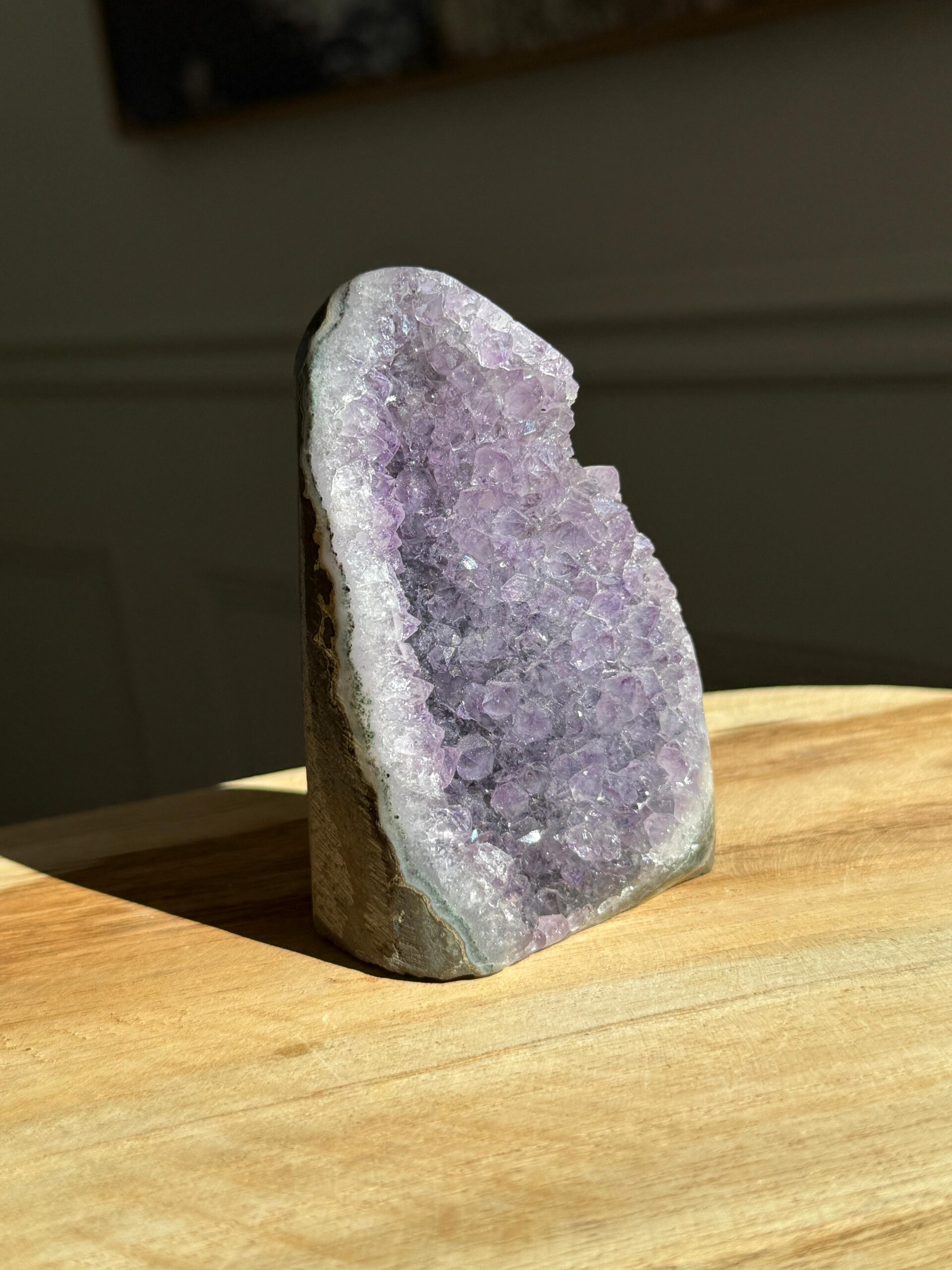 Amethist heeft een rustgevende, beschermende en zuiverende werking en wordt geassocieerd met het loslaten van negatieve gedachten, het bevorderen van innerlijke rust en het versterken van spiritualiteit en intuïtie. De steen zou ondersteuning bieden bij stress, slapeloosheid, hoofdpijn en het verwerken van trauma’s.
