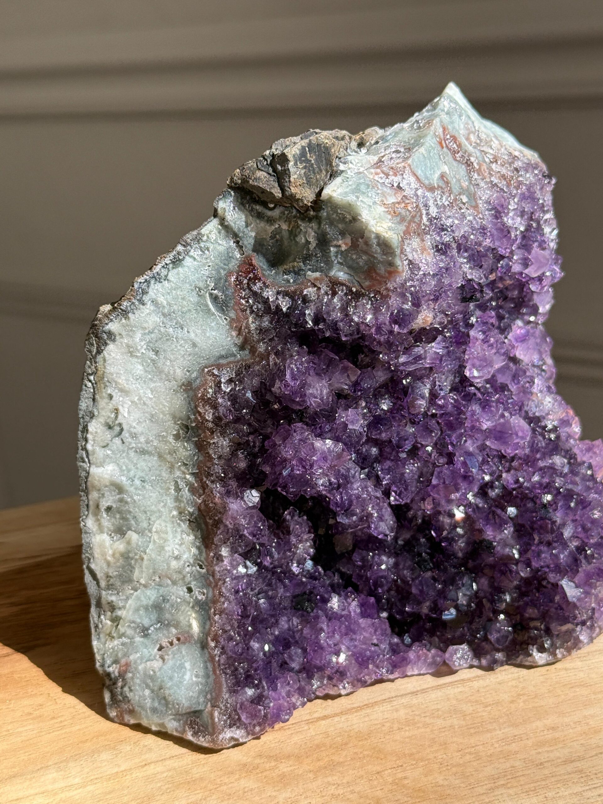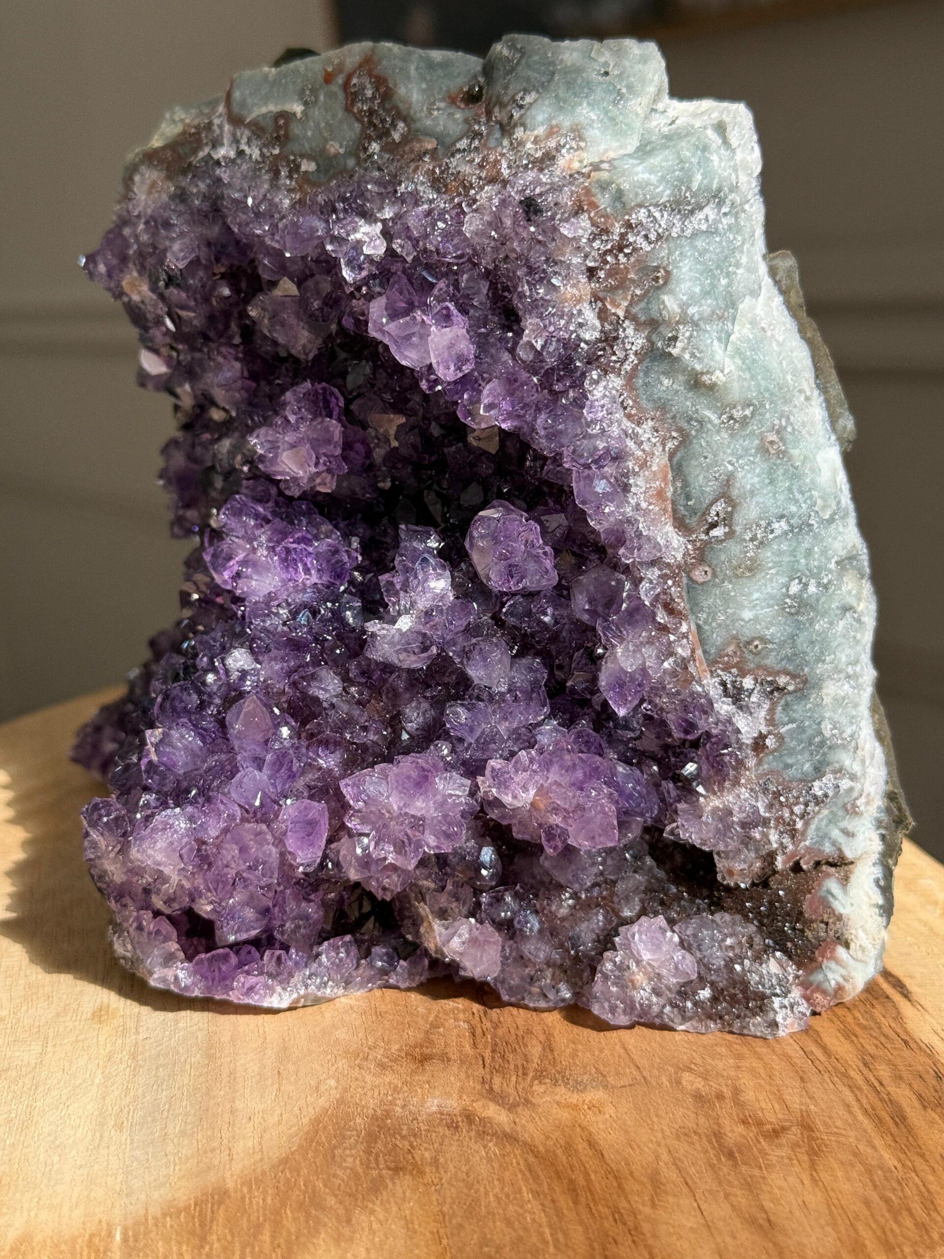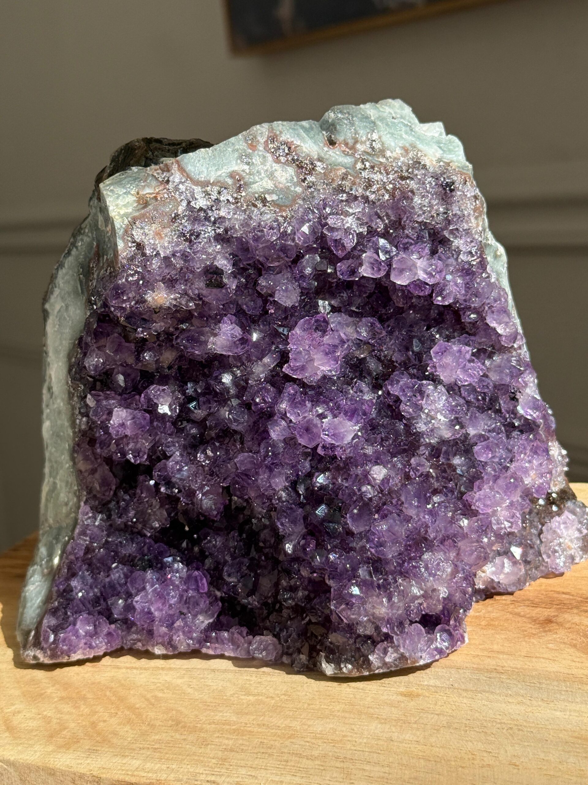 Amethist heeft een rustgevende, beschermende en zuiverende werking en wordt geassocieerd met het loslaten van negatieve gedachten, het bevorderen van innerlijke rust en het versterken van spiritualiteit en intuïtie. De steen zou ondersteuning bieden bij stress, slapeloosheid, hoofdpijn en het verwerken van trauma’s.